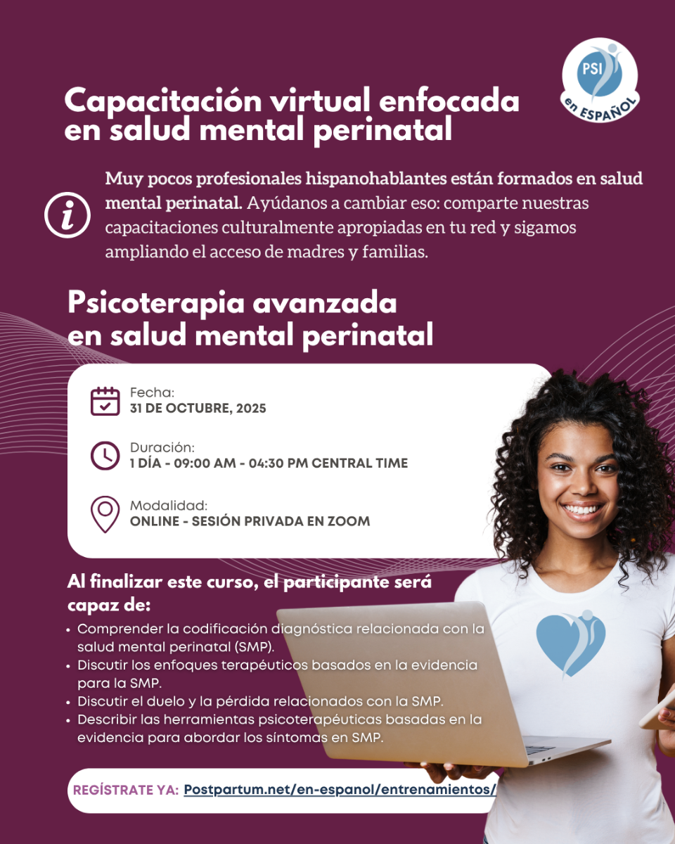 Aviso: Este evento se presentará a través de un seminario web por Zoom. Las instrucciones para unirse al seminario web de Zoom se le enviarán por correo electrónico la semana anterior a la capacitación. En caso de no recibir un mensaje titulado: "Enlace Zoom..." en su bandeja de entrada antes de que finalice la semana, primero revise su carpeta de basura, correo no deseado, spam o promociones. Si sigue sin encontrarlo, póngase en contacto de inmediato con orrinbanta@postpartum.net. No espere hasta un día antes de la capacitación.